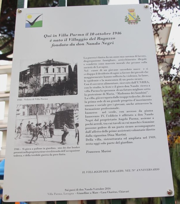 La guerra è finita da un anno, ma carenza di lavoro, disgregazione familiare, arricchimento illegale e vendette sono macerie che pesano nel cuore di Lavagna.  Nel cuore di un giovane sacerdote nasce e si sviluppa il desiderio di agire a favore dei piccoli che maggiormente hanno sofferto la violenza, la fame, le epidemie e la mancanza di un posto sicuro. Con il soccorso alimentare ricevuto dall’UNRRA, con lo studio, le feste e il gioco, don Nando ricrea a Villa Parma la speranza di un futuro migliore sotto la protezione di Maria, Madonna dei Bambini.